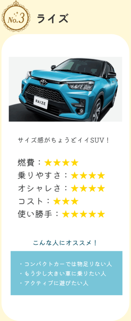 これらのモデルは、いずれもスタイリッシュなデザインと取り回しの良さを両立しており、都市部での利用に最適です。なかでもC-HRは、個性的なエクステリアと高品質なインテリア素材が多くの女性ユーザーから支持されています。